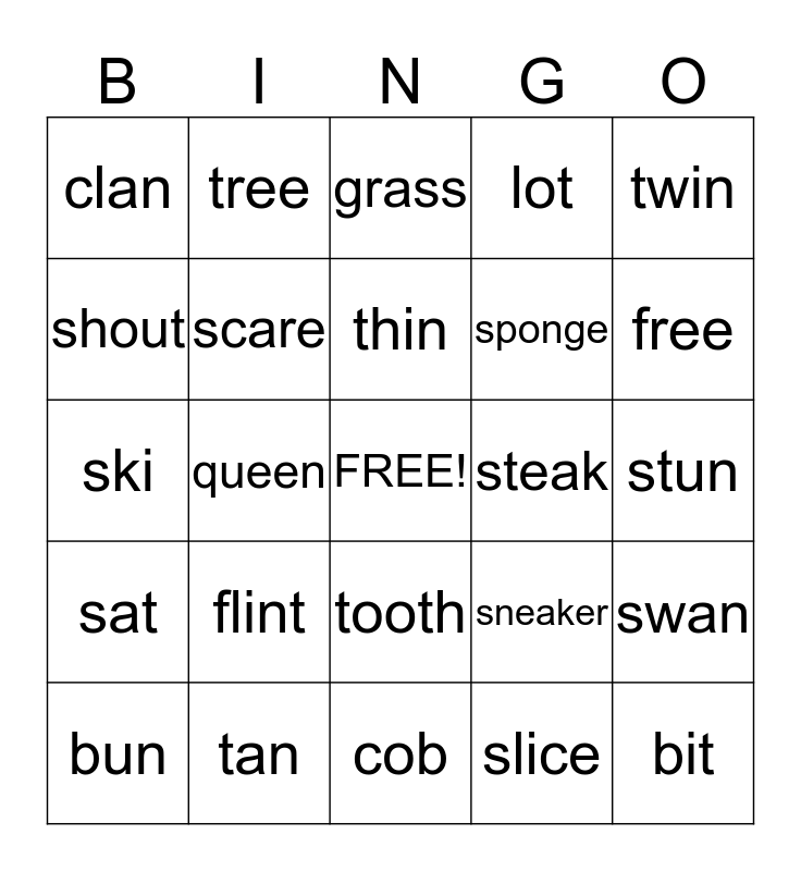 This bingo card has a free space and 24 words: flint, tan, thin, bun, twin, clan, shout, tree, steak, tooth, sponge, ski, sneaker, swan, scare, slice, stun, grass, free, queen, bit, sat, lot and cob.