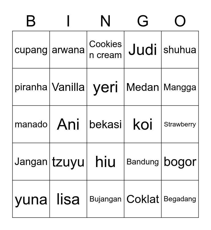 This bingo card has a free space and 24 words: tzuyu, lisa, yeri, yuna, shuhua, cupang, piranha, arwana, koi, hiu, Medan, manado, Bandung, bogor, Vanilla, Coklat, Strawberry, Cookies n cream, Mangga, Ani, Begadang, Jangan, Judi and Bujangan.