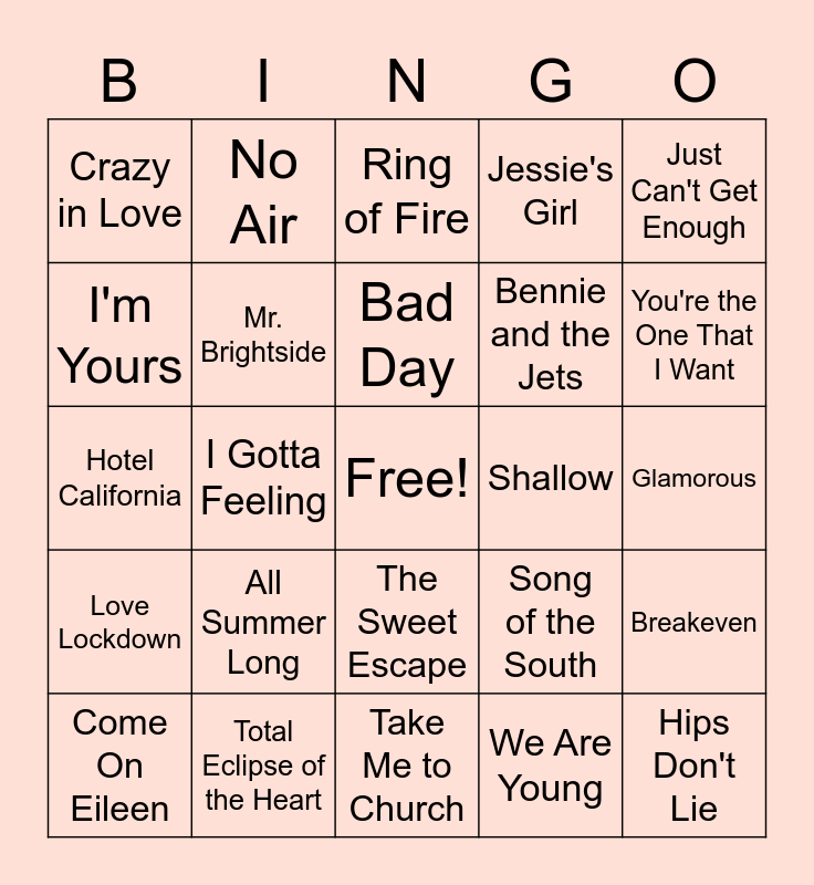 This bingo card has a free space and 27 words: Song of the South, Where is the Love?, Bennie and the Jets, Take Me to Church, I'm Yours, Ring of Fire, No Air, Love Lockdown, Shallow, Breakeven, Hotel California, Jessie's Girl, Come On Eileen, Total Eclipse of the Heart, You're the One That I Want, Bohemian Rhapsody, Mr. Brightside, Bad Day, All Summer Long, Crazy in Love, Glamorous, We Are Young, I Gotta Feeling, Hips Don't Lie, The Sweet Escape, Just Can't Get Enough and Hooked on a Feeling.