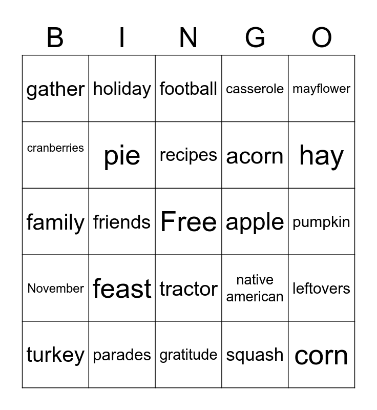 This bingo card has a free space and 29 words: turkey, thankful, friends, harvest, gather, football, pie, feast, apple, parades, pumpkin, corn, gratitude, squash, hay, leaves, tractor, November, mayflower, family, native american, cider, acorn, cranberries, casserole, holiday, leftovers, recipes and tradition.