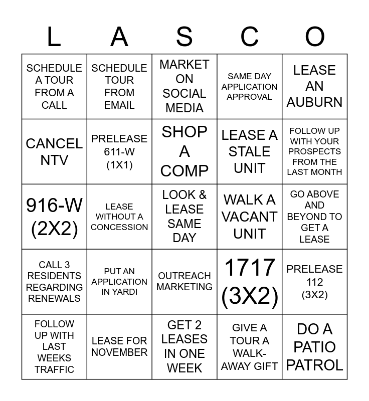This bingo card has a free space and 24 words: PUT AN APPLICATION IN YARDI, LEASE FOR NOVEMBER, SHOP A COMP, FOLLOW UP WITH LAST WEEKS TRAFFIC, LEASE AN AUBURN, SCHEDULE A TOUR FROM A CALL, CANCEL NTV, SCHEDULE TOUR FROM EMAIL, WALK A VACANT UNIT, OUTREACH MARKETING, LEASE A STALE UNIT, 916-W (2X2), 1717 (3X2), PRELEASE 112 (3X2), PRELEASE 611-W (1X1), GIVE A TOUR A WALK-AWAY GIFT, GO ABOVE AND BEYOND TO GET A LEASE, MARKET ON SOCIAL MEDIA, FOLLOW UP WITH YOUR PROSPECTS FROM THE LAST MONTH, LEASE WITHOUT A CONCESSION, DO A PATIO PATROL, CALL 3 RESIDENTS REGARDING RENEWALS, SAME DAY APPLICATION APPROVAL and GET 2 LEASES IN ONE WEEK.