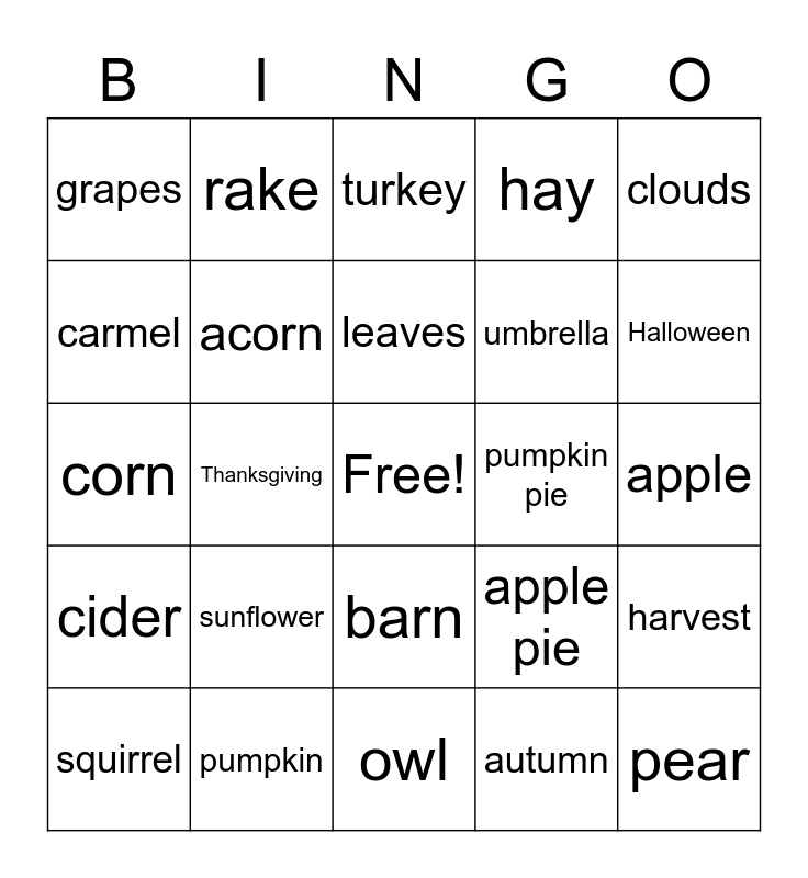 This bingo card has a free space and 24 words: sunflower, pumpkin, leaves, squirrel, clouds, grapes, carmel, rake, pumpkin pie, barn, umbrella, corn, apple pie, harvest, acorn, autumn, apple, turkey, Halloween, Thanksgiving, pear, cider, hay and owl.