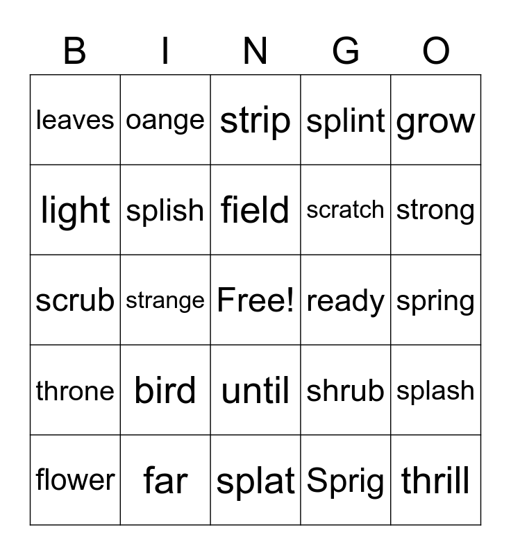 This bingo card has a free space and 24 words: bird, far, field, flower, grow, leaves, light, oange, ready, until, scratch, scrub, shrub, splash, splish, Sprig, spring, strip, strong, strange, thrill, throne, splint and splat.