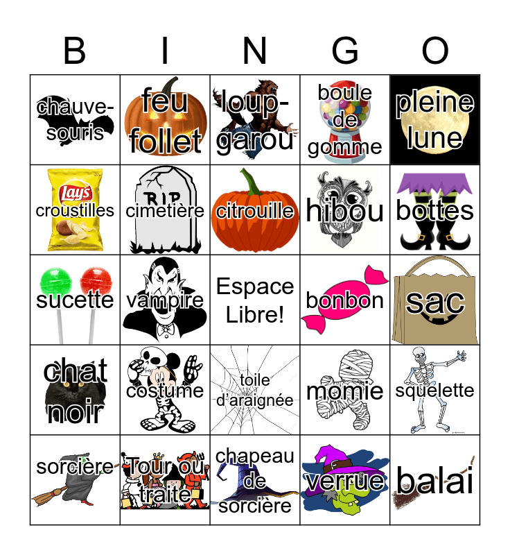 This bingo card has 29 images, a free space and 29 words: sorcière, fantôme, vampire, chaudron noir, chauve-souris, loup-garou, cimetière, costume, bonbon, Tour ou traite, sac, balai, chapeau de sorcière, verrue, bottes, maison hantée, toile d’araignée, chat noir, pleine lune, sucette, momie, zombie, hibou, croustilles, boule de gomme, feu follet, squelette, citrouille and pomme d’amour.