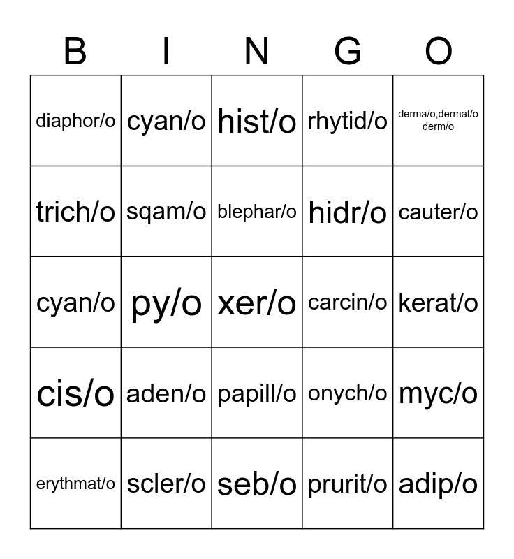This bingo card has 25 words: aden/o, seb/o, blephar/o, erythmat/o, derma/o,dermat/o derm/o, diaphor/o, trich/o, cyan/o, carcin/o, papill/o, hidr/o, cyan/o, onych/o, myc/o, sqam/o, adip/o, kerat/o, hist/o, cauter/o, py/o, xer/o, scler/o, cis/o, rhytid/o and prurit/o.