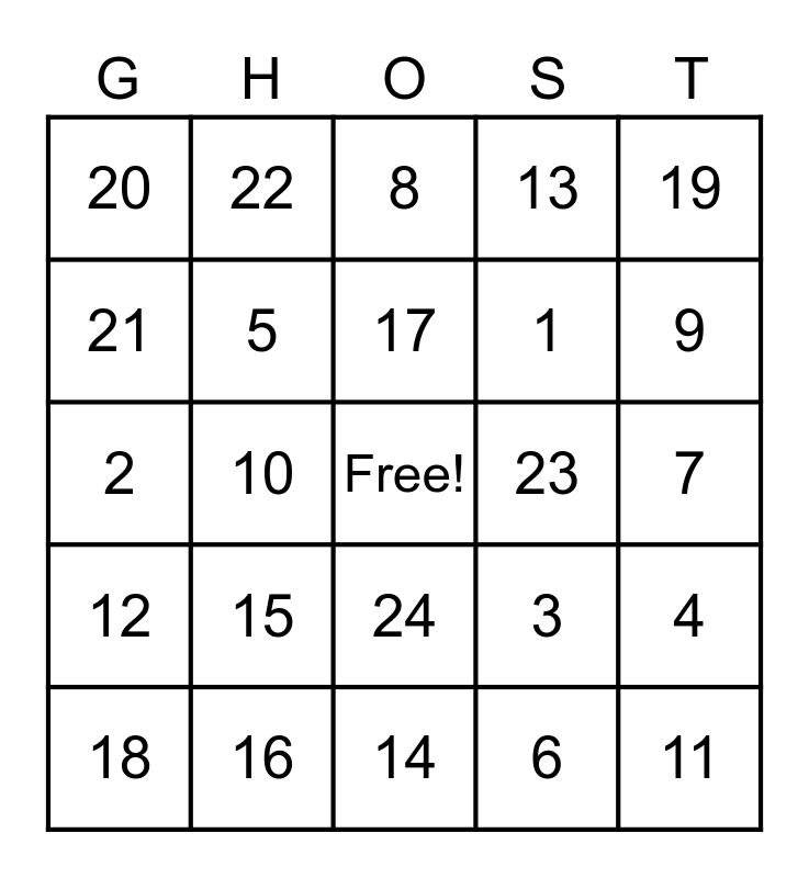 This bingo card has a free space and 24 words: 15, 16, 17, 18, 19, 20, 21, 22, 23, 24, 1, 2, 3, 4, 5, 6, 7, 8, 9, 10, 11, 12, 13 and 14.