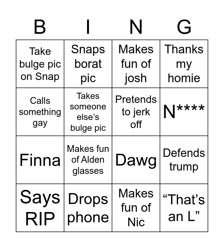 This bingo card has 24 words: Ur mom(got em), Hurts his private parts, N****, C****, Calls something gay, Take bulge pic on Snap, Takes someone else’s bulge pic, Snaps borat pic, Drops phone, My homie, Finna, Dawg, I gotchu, Pretends to f*** something, Pretends to jerk off, Bruh, Makes fun of Nic, Makes fun of josh, Makes fun of Alden glasses, Defends trump, Says RIP, “That’s an L”, Thanks my homie and Ayo.