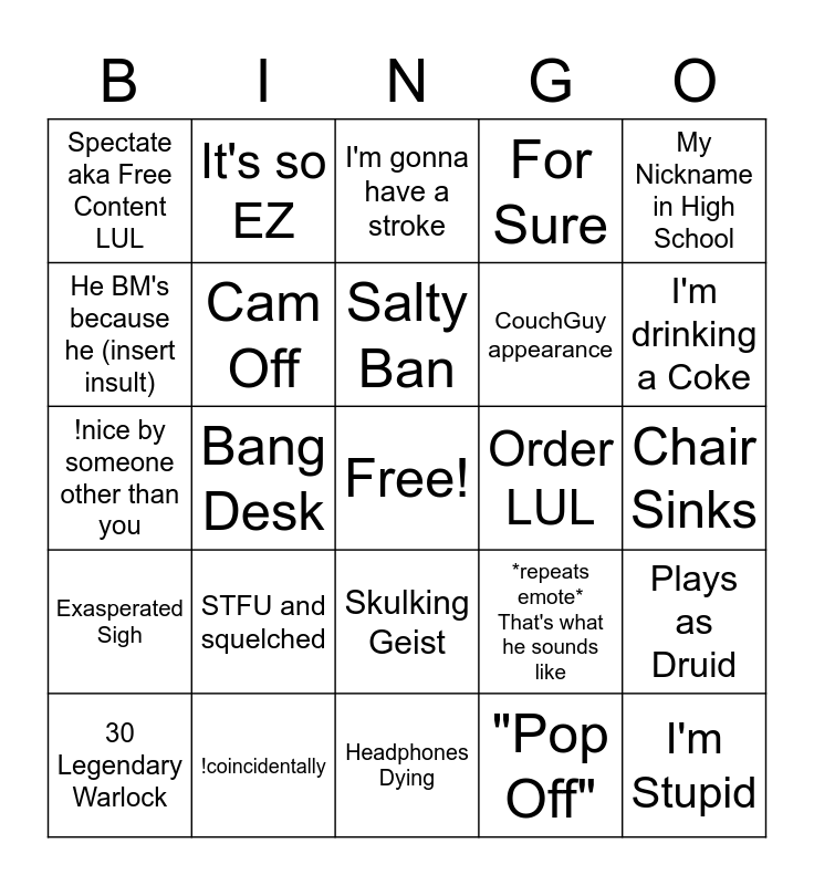 This bingo card has a free space and 39 words: Boomer APM, Flik Gang, -1000 KEKW, Cam Off, 30 Legendary Warlock, Skulking Geist, Salty Ban, Sniping¿, My Nickname in High School, Exasperated Sigh, Bang Desk, For Sure, I'm Stupid, Chair Sinks, Order LUL, STFU and squelched, Like That, Spectate aka Free Content LUL, Platebreaker, *repeats emote* That's what he sounds like, He BM's because he (insert insult), Headphones Dying, CouchGuy appearance, I'm drinking a Coke, I'm drinking (something other than coke), Vargoth Kills Himself, SUPER HIGHROLLED, Order Food, brb gonna go heat up some..., It's so EZ, NO SKRUBS, Smoking Cam, I'm gonna have a stroke, !coincidentally, "Pop Off", Plays as Priest, Plays as Druid, !nice by someone other than you and Are you kidding me?.