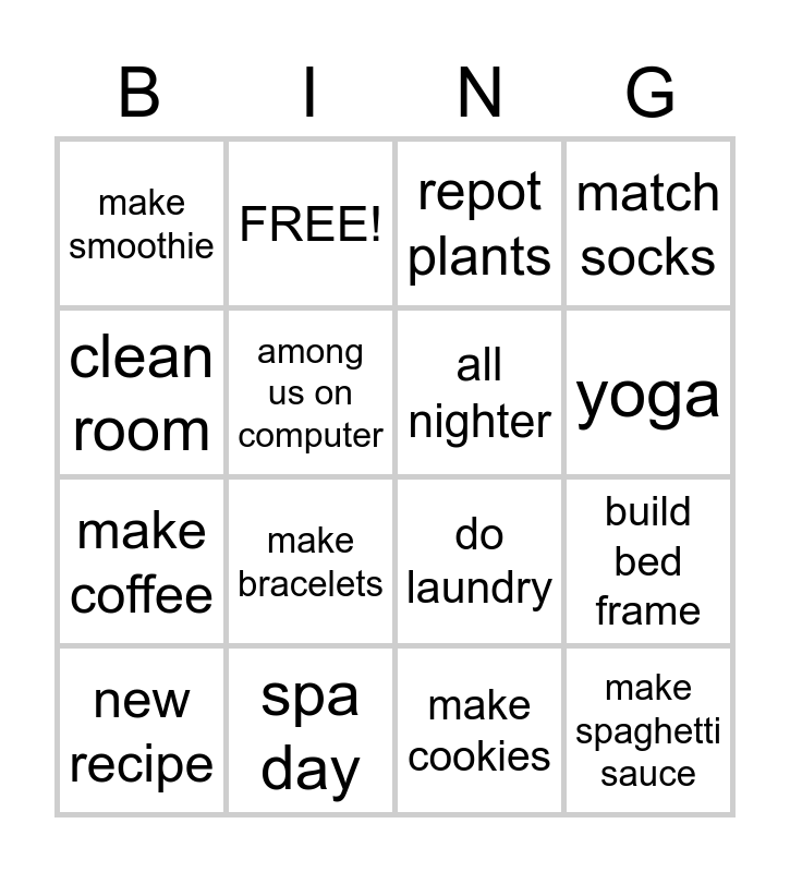 This bingo card has 16 words: spa day, build bed frame, repot plants, make smoothie, make coffee, FREE!, do laundry, make cookies, clean room, among us on computer, new recipe, match socks, make bracelets, yoga, all nighter and make spaghetti sauce.