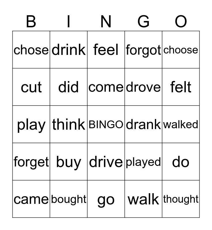 This bingo card has a free space and 24 words: buy, bought, come, came, choose, chose, cut, drink, drank, drive, drove, play, played, do, did, walk, walked, feel, felt, think, thought, forget, forgot and go.