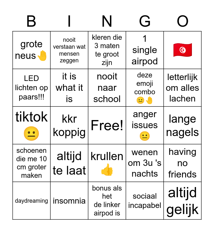 This bingo card has a free space and 24 words: altijd te laat, insomnia, nooit naar school, daydreaming, πΉπ³, grote neusπ€, LED lichten op paars!!!, nooit verstaan wat mensen zeggen, anger issuesπ, krullen π, deze emoji combo ππ€, tiktokπ, wenen om 3u 's nachts, having no friends, it is what it is, sociaal incapabel, lange nagels, kleren die 3 maten te groot zijn, letterlijk om alles lachen, kkr koppig, altijd gelijk, schoenen die me 10 cm groter maken, 1 single airpod and bonus als het de linker airpod is.