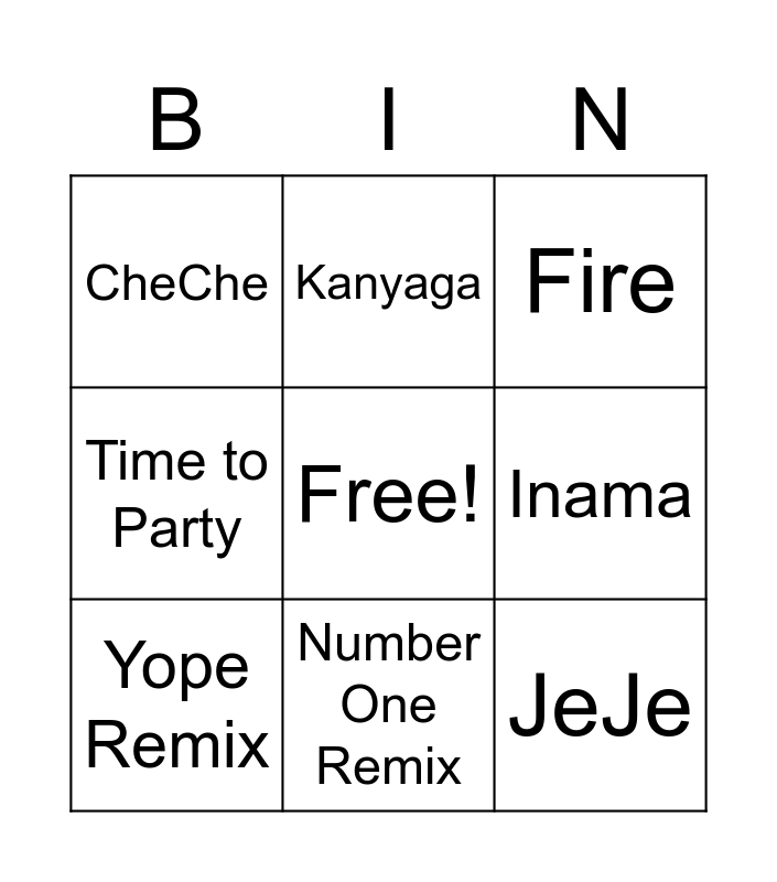 This bingo card has a free space and 8 words: Inama, Fire, Kanyaga, Yope Remix, CheChe, JeJe, Time to Party and Number One Remix.