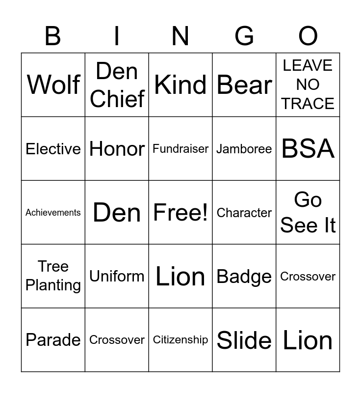 ⚠ This card has duplicate items: Achievements (2), Adventure (2), Arrow of Light (2), Awards (2), Baden Powell (2), Badge (2), Bear (2), Belt Loops (2), Be Prepared (2), Blue & Gold (2), Bobcat (2), Brave (2), BSA (2), Buddy system (2), Character (2), Cheerful (2), Citizenship (2), Clean (2), Color Guard (2), Community Service (2), Courteous (2), Crossover (2), Cubmaster (2), Cub Scout (2), Dad and Me Camp (2), Den (2), Den Chief (2), Do Your Best (2), Elective (2), Essentials (2), Family Camp (2), Flag Ceremony (2), Fundraiser (2), Go See It (2), Hand Shake (2), Helpful (2), Hiking (2), Honor (2), Jamboree (2), Kind (2), Leadership (2), LEAVE NO TRACE (2), Lion (2), Loyal (2), Mom and Me Camp (2), Motto (2), Neckerchief (2), Oath (2), Obedient (2), Pack 267 (2), Pack meetings (2), Pal and Me Camp (2), Parade (2), Pinewood Derby (2), Pins (2), Promise (2), Raingutter Regatta (2), Rank (2), Reverent (2), Salmon Toss (2), Scout Law (2), Slide (2), Shooting Sports (2), Thrifty (2), Tiger (2), Tree Planting (2), Trustworthy (2), Uniform (2), WashJam (2), Webelos (2), Whittling Chip (2), Wolf (2)