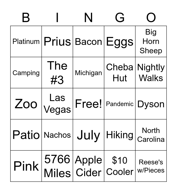 This bingo card has a free space and 76 words: Music Studio, DutchBros, Bacon, Cooking, Beach, Cauliflower, Minnesota, Tattoos, Gray Sweatpants, The Egg and I, Road Trips, Melissa's Office, Michigan, Camping, Banza Noodles, Las Vegas, Stonerhop, Reese's w/Pieces, Ew, David!, Big Horn Sheep, Alone time, Zoo, The #3, Prius, Eggs, Las Vegas, Ocean Blue, Coral, Mary, Idaho, Arizona, Colorado, Waterfall, Hiking, Nightly Walks, Cheba Hut, Cocomo, Carmelizer, Dyson, $10 Cooler, Twin Flame, Leo, Virgo, Paul, Mae, Orange, Pink, Platinum, POF, Bi, November, July, Sedona, Security, Rainbow, Tacos, InstantPot, Sarah, Gummies, Parsley, Nachos, Donuts, Meijer, Hy-Vee, Sense8, Audiobooks, Pandemic, Pinch Me, Dishes, Yellow, North Carolina, Patio, 5766 Miles, 2020, Apple Cider and Baths.