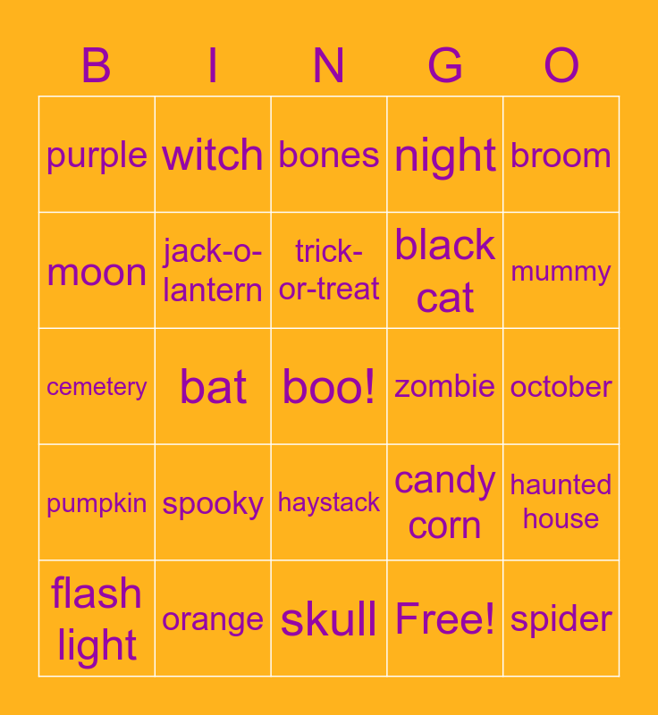 This bingo card has 32 words: Free!, halloween, bat, candy, pumpkin, jack-o-lantern, broom, haunted house, witch, spider, trick-or-treat, bones, shawdows, costume, zombie, mask, flash light, cemetery, haystack, spooky, candy corn, scary, october, orange, boo!, night, black cat, moon, purple, skull, vampire and mummy.