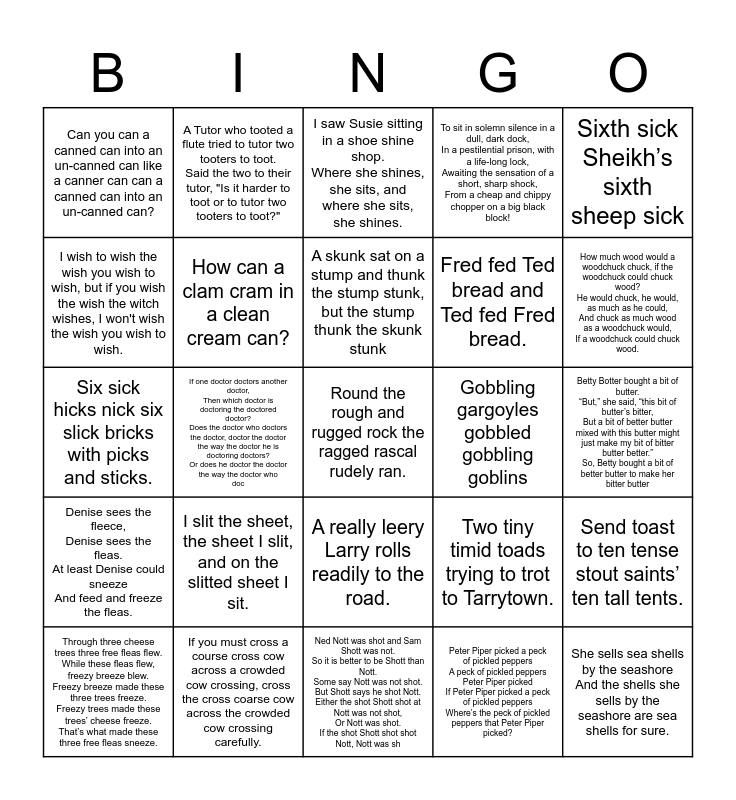 This bingo card has a free space and 24 words: I slit the sheet, the sheet I slit, and on the slitted sheet I sit., If you must cross a course cross cow across a crowded cow crossing, cross the cross coarse cow across the crowded cow crossing carefully., A skunk sat on a stump and thunk the stump stunk, but the stump thunk the skunk stunk, Through three cheese trees three free fleas flew. While these fleas flew, freezy breeze blew. Freezy breeze made these three trees freeze. Freezy trees made these trees’ cheese freeze. That’s what made these three free fleas sneeze., Sixth sick Sheikh’s sixth sheep sick, Can you can a canned can into an un-canned can like a canner can can a canned can into an un-canned can?, I wish to wish the wish you wish to wish, but if you wish the wish the witch wishes, I won't wish the wish you wish to wish., A Tutor who tooted a flute tried to tutor two tooters to toot. Said the two to their tutor, "Is it harder to toot or to tutor two tooters to toot?", Gobbling gargoyles gobbled gobbling goblins, A really leery Larry rolls readily to the road., Fred fed Ted bread and Ted fed Fred bread., Six sick hicks nick six slick bricks with picks and sticks., Two tiny timid toads trying to trot to Tarrytown., Send toast to ten tense stout saints’ ten tall tents., How can a clam cram in a clean cream can?, Peter Piper picked a peck of pickled peppers A peck of pickled peppers Peter Piper picked If Peter Piper picked a peck of pickled peppers Where’s the peck of pickled peppers that Peter Piper picked?, Betty Botter bought a bit of butter. “But,” she said, “this bit of butter’s bitter, But a bit of better butter mixed with this butter might just make my bit of bitter butter better.” So, Betty bought a bit of better butter to make her bitter butter, I saw Susie sitting in a shoe shine shop. Where she shines, she sits, and where she sits, she shines., How much wood would a woodchuck chuck, if the woodchuck could chuck wood? He would chuck, he would, as much as he could, And chuck as much wood as a woodchuck would, If a woodchuck could chuck wood., If one doctor doctors another doctor, Then which doctor is doctoring the doctored doctor? Does the doctor who doctors the doctor, doctor the doctor the way the doctor he is doctoring doctors? Or does he doctor the doctor the way the doctor who doc, She sells sea shells by the seashore And the shells she sells by the seashore are sea shells for sure., Denise sees the fleece, Denise sees the fleas. At least Denise could sneeze And feed and freeze the fleas., To sit in solemn silence in a dull, dark dock, In a pestilential prison, with a life-long lock, Awaiting the sensation of a short, sharp shock, From a cheap and chippy chopper on a big black block! and Ned Nott was shot and Sam Shott was not. So it is better to be Shott than Nott. Some say Nott was not shot. But Shott says he shot Nott. Either the shot Shott shot at Nott was not shot, Or Nott was shot. If the shot Shott shot shot Nott, Nott was sh.