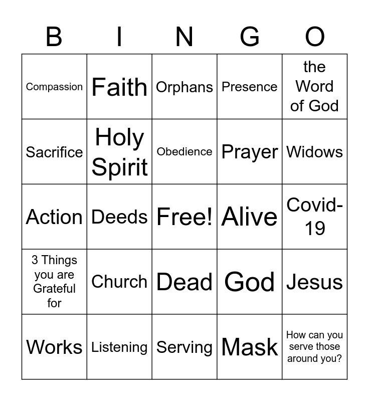 This bingo card has a free space and 24 words: Church, Listening, Obedience, Works, the Word of God, Compassion, Sacrifice, Faith, Alive, Dead, Prayer, Action, God, Jesus, Holy Spirit, Mask, Covid-19, Orphans, Widows, Deeds, How can you serve those around you?, 3 Things you are Grateful for, Presence and Serving.