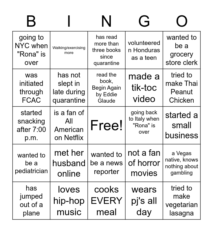 This bingo card has a free space and 24 words: met her husband online, loves hip-hop music, read the book, Begin Again by Eddie Glaude, has jumped out of a plane, wanted to be a grocery store clerk, going to NYC when "Rona" is over, was initiated through FCAC, Walking/exercising more, going back to Italy when "Rona" is over, wanted to be a news reporter, made a tik-toc video, started snacking after 7:00 p.m., not a fan of horror movies, a Vegas native, knows nothing about gambling, has not slept in late during quarantine, wears pj's all day, started a small business, has read more than three books since quarantine, tried to make Thai Peanut Chicken, is a fan of All American on Netflix, tried to make vegetarian lasagna, wanted to be a pediatrician, volunteered n Honduras as a teen and cooks EVERY meal.