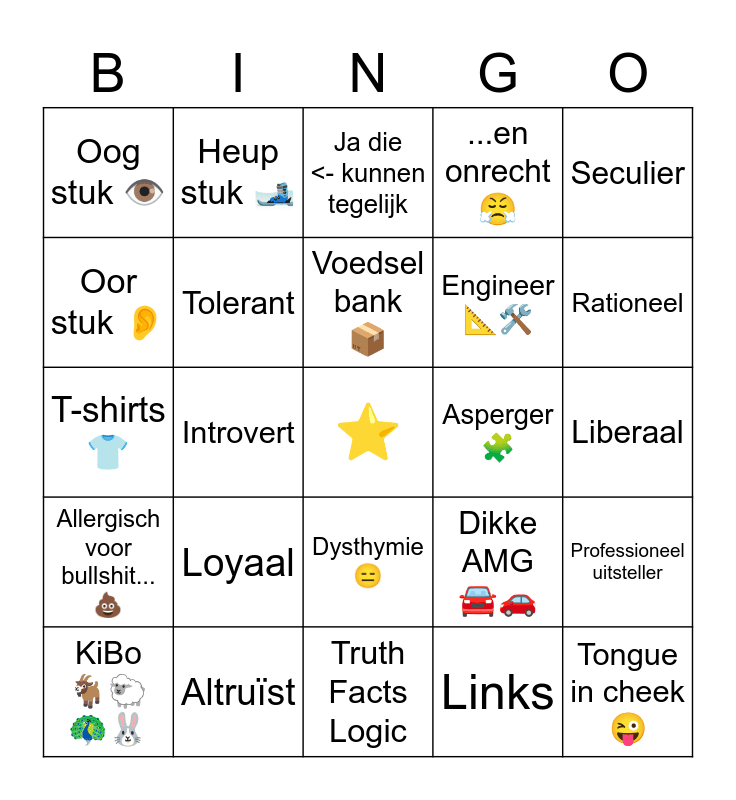This bingo card has a free space and 24 words: Loyaal, AltruΓ―st, Voedsel bank π¦, KiBo πππ¦π°, Seculier, Oog stuk ποΈ, Oor stuk π, Heup stuk πΏ, Asperger π§©, Dysthymie π, Engineerππ οΈ, T-shirts π, Dikke AMG ππ, Professioneel uitsteller, Tolerant, Links, Liberaal, Ja die <- kunnen tegelijk, Rationeel, Introvert, Tongue in cheek π, Allergisch voor bullshit...π©, ...en onrecht π€ and Truth Facts Logic.