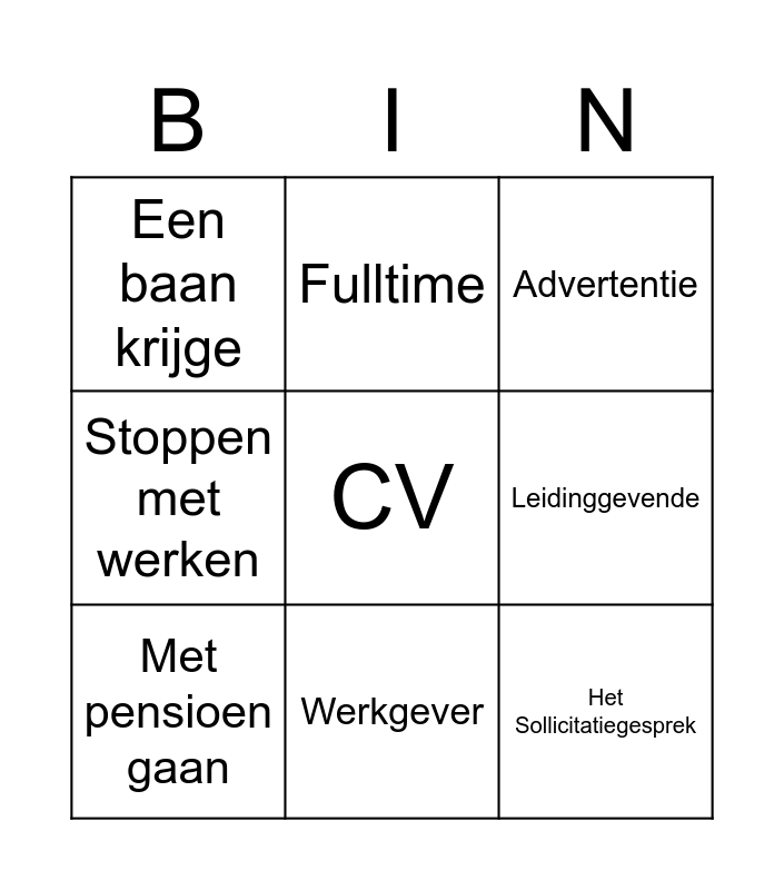 This bingo card has 19 words: Free!, Aan het werk gaan, Advertentie, Bingo woorden, Curriculum vitae, CV, De Vacature, Een baan krijge, Fulltime, Het Sollicitatiegesprek, Iemand aannemen, Leidinggevende, Met pensioen gaan, Ontslag krijgen, Ontslag nemen, Sollicitatiebrief schrijven, Stoppen met werken, Werkgever and Werknemer.
