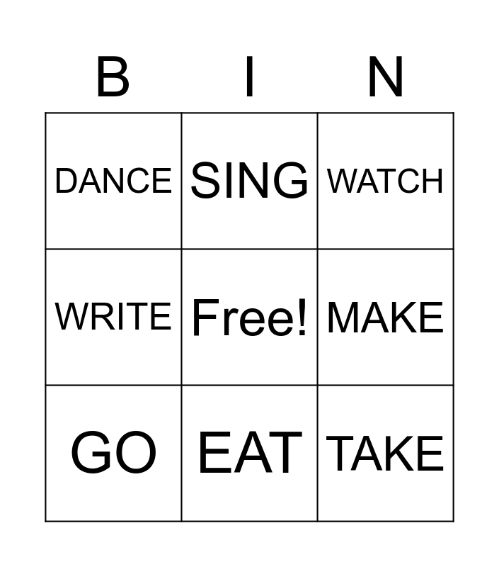 This bingo card has a free space and 8 words: MAKE, WATCH, SING, GO, DANCE, TAKE, WRITE and EAT.