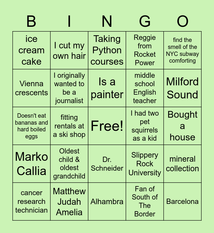 This bingo card has a free space and 24 words: Oldest child & oldest grandchild, Matthew Judah Amelia, Is a painter, cancer research technician, find the smell of the NYC subway comforting, ice cream cake, Vienna crescents, I cut my own hair, I had two pet squirrels as a kid, Dr. Schneider, middle school English teacher, Doesn't eat bananas and hard boiled eggs, Slippery Rock University, mineral collection, I originally wanted to be a journalist, Fan of South of The Border, Bought a house, Taking Python courses, Milford Sound, fitting rentals at a ski shop, Barcelona, Marko Callia, Reggie from Rocket Power and Alhambra.
