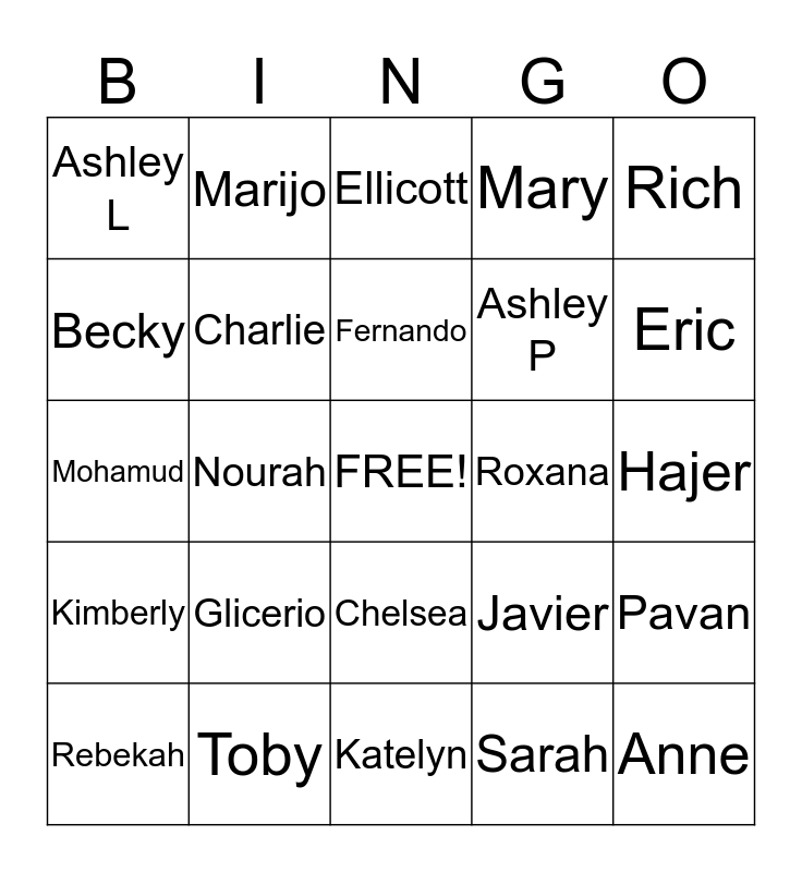 This bingo card has a free space and 24 words: Glicerio, Toby, Fernando, Rebekah, Rich, Ashley L, Becky, Marijo, Roxana, Chelsea, Ashley P, Mohamud, Javier, Pavan, Charlie, Sarah, Hajer, Ellicott, Eric, Nourah, Anne, Kimberly, Mary and Katelyn.