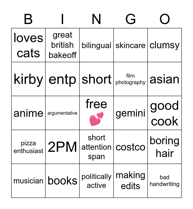 This bingo card has a free space and 24 words: musician, 2PM, short, making edits, clumsy, loves cats, great british bakeoff, bilingual, gemini, good cook, anime, entp, costco, boring hair, kirby, books, politically active, skincare, asian, pizza enthusiast, argumentative, short attention span, film photography and bad handwriting.