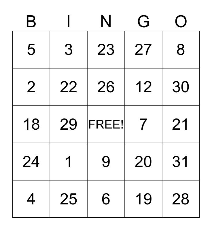 This bingo card has a free space and 24 words: 1, 25, 26, 4, 8, 5, 2, 3, 7, 9, 12, 18, 20, 31, 22, 19, 21, 23, 30, 29, 28, 24, 27 and 6.