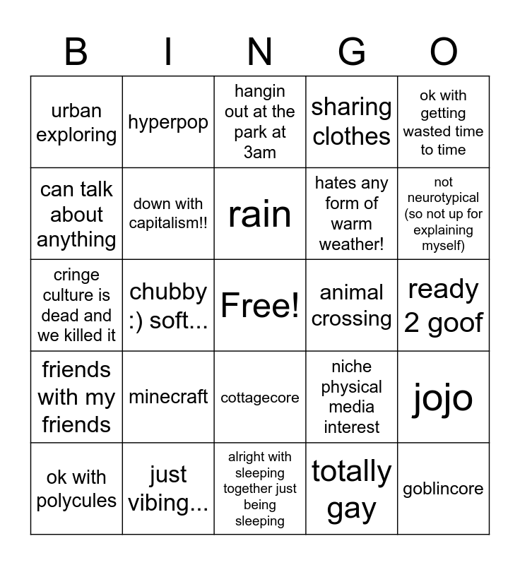 This bingo card has a free space and 24 words: minecraft, just vibing..., rain, ok with polycules, ok with getting wasted time to time, urban exploring, can talk about anything, hyperpop, animal crossing, cottagecore, hates any form of warm weather!, cringe culture is dead and we killed it, niche physical media interest, jojo, down with capitalism!!, totally gay, ready 2 goof, hangin out at the park at 3am, not neurotypical (so not up for explaining myself), chubby :) soft..., goblincore, friends with my friends, sharing clothes and alright with sleeping together just being sleeping.