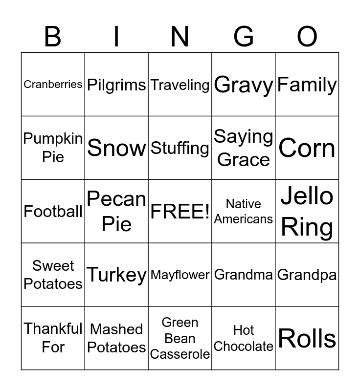 This bingo card has a free space and 24 words: Turkey, Mashed Potatoes, Stuffing, Thankful For, Family, Cranberries, Pumpkin Pie, Pilgrims, Native Americans, Mayflower, Saying Grace, Football, Grandma, Grandpa, Snow, Hot Chocolate, Jello Ring, Traveling, Corn, Pecan Pie, Rolls, Sweet Potatoes, Gravy and Green Bean Casserole.