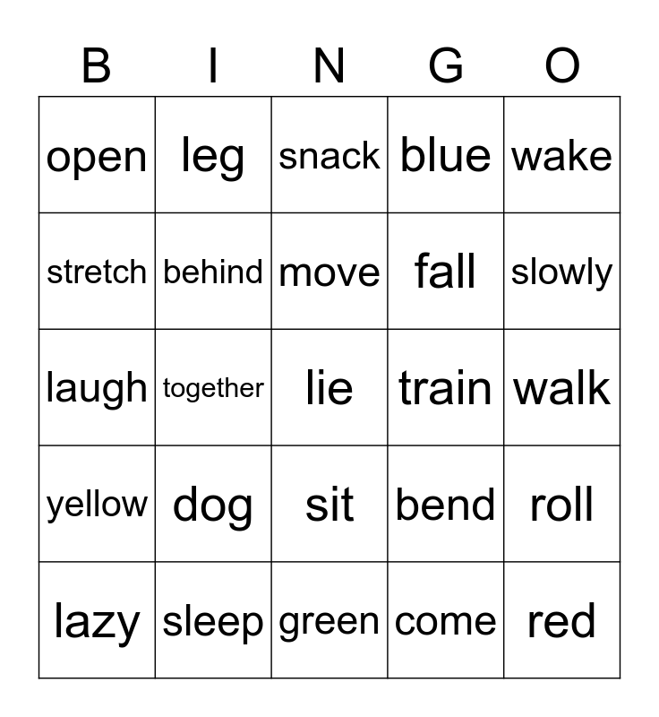 This bingo card has a free space and 24 words: dog, sleep, move, lazy, wake, open, stretch, leg, train, sit, fall, laugh, bend, roll, behind, come, walk, snack, slowly, together, red, yellow, blue and green.