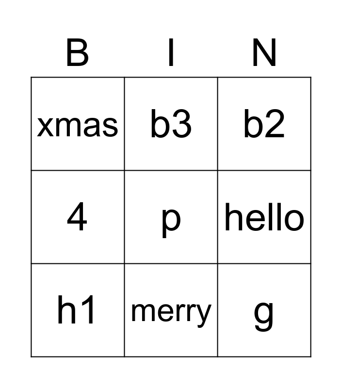 This bingo card has 9 words: h1, b2, b3, 4, xmas, hello, p, g and merry.