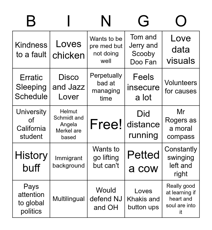 This bingo card has a free space and 24 words: Immigrant background, Multilingual, Perpetually bad at managing time, Pays attention to global politics, Love data visuals, Kindness to a fault, Erratic Sleeping Schedule, Loves chicken, Did distance running, Wants to go lifting but can't, Feels insecure a lot, University of California student, Petted a cow, Constantly swinging left and right, Disco and Jazz Lover, Loves Khakis and button ups, Mr Rogers as a moral compass, Wants to be pre med but not doing well, Volunteers for causes, Helmut Schmidt and Angela Merkel are based, Really good at learning if heart and soul are into it, History buff, Tom and Jerry and Scooby Doo Fan and Would defend NJ and OH.