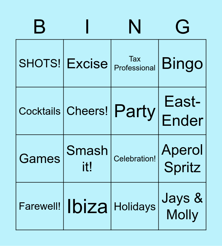 This bingo card has 32 words: Hayley, TSP, Aperol Spritz, Bali, Jays & Molly, Party, Cocktails, Good Luck!, Excise, Congratulations!, East-Ender, Tax Professional, No more Landfill Tax, Leaving Do!, Ibiza, Success, Beattie, Celebration!, Legend, Dancing, All the best!, Hilarity, Holidays, New Job, Farewell!, Bingo, Games, Cheers!, SHOTS!, Croatia, Music! and Smash it!.