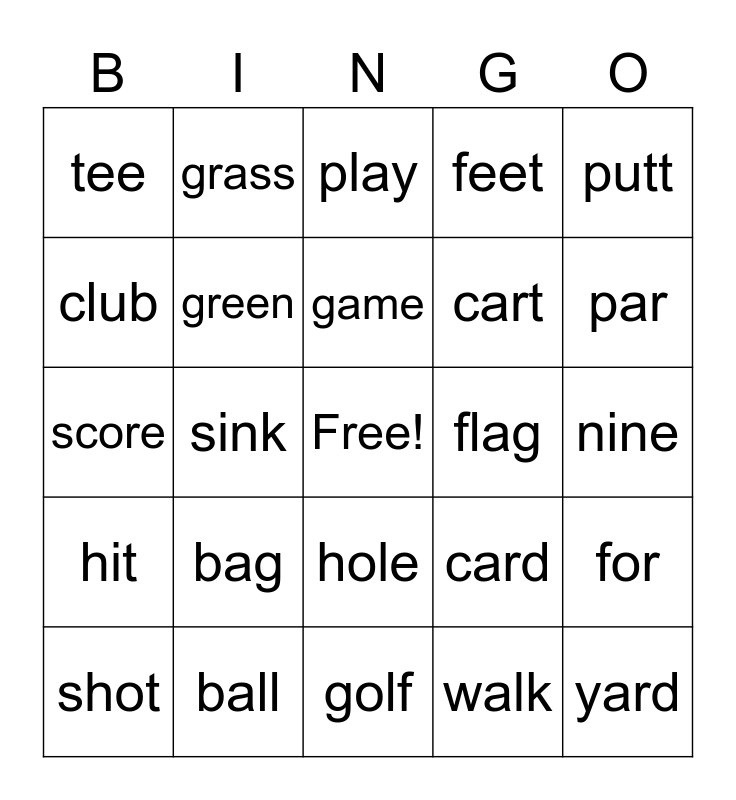 This bingo card has a free space and 25 words: bag, golf, game, shot, putt, tee, club, grass, flag, hole, cart, score, card, for, green, cup, nine, play, par, sink, yard, ball, hit, feet and walk.