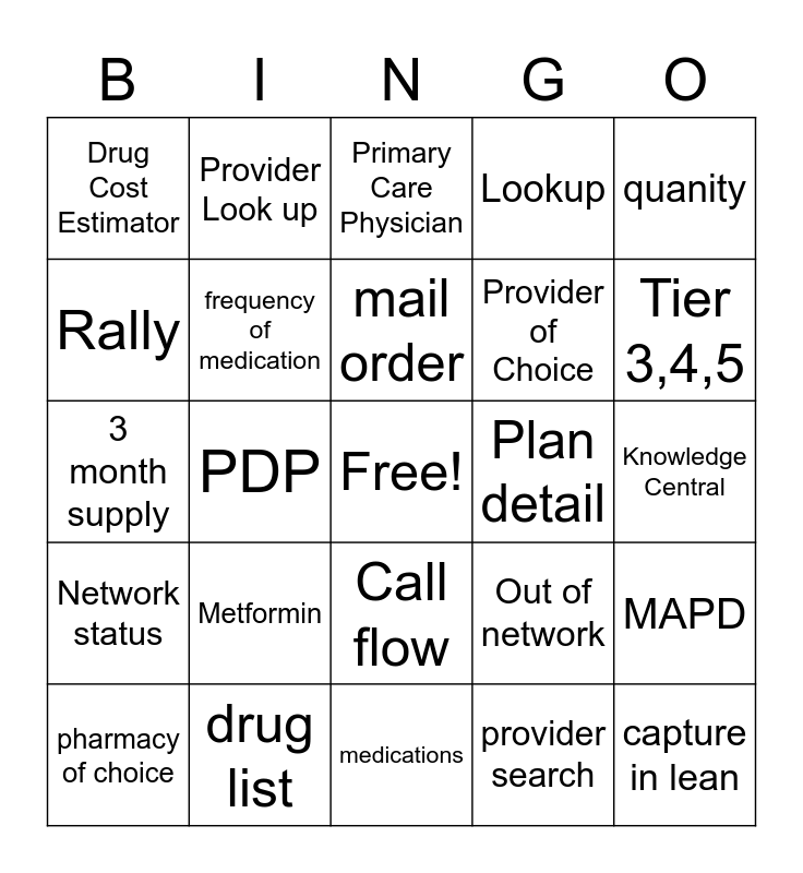 This bingo card has a free space and 24 words: Metformin, drug list, mail order, pharmacy of choice, quanity, Drug Cost Estimator, Rally, Provider Look up, Plan detail, Call flow, Provider of Choice, 3 month supply, Out of network, MAPD, frequency of medication, provider search, Knowledge Central, Primary Care Physician, Tier 3,4,5, PDP, capture in lean, Network status, Lookup and medications.