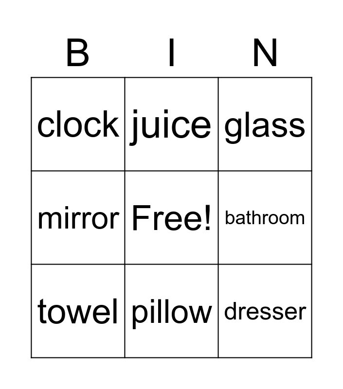 This bingo card has a free space and 8 words: bathroom, glass, juice, towel, clock, dresser, mirror and pillow.