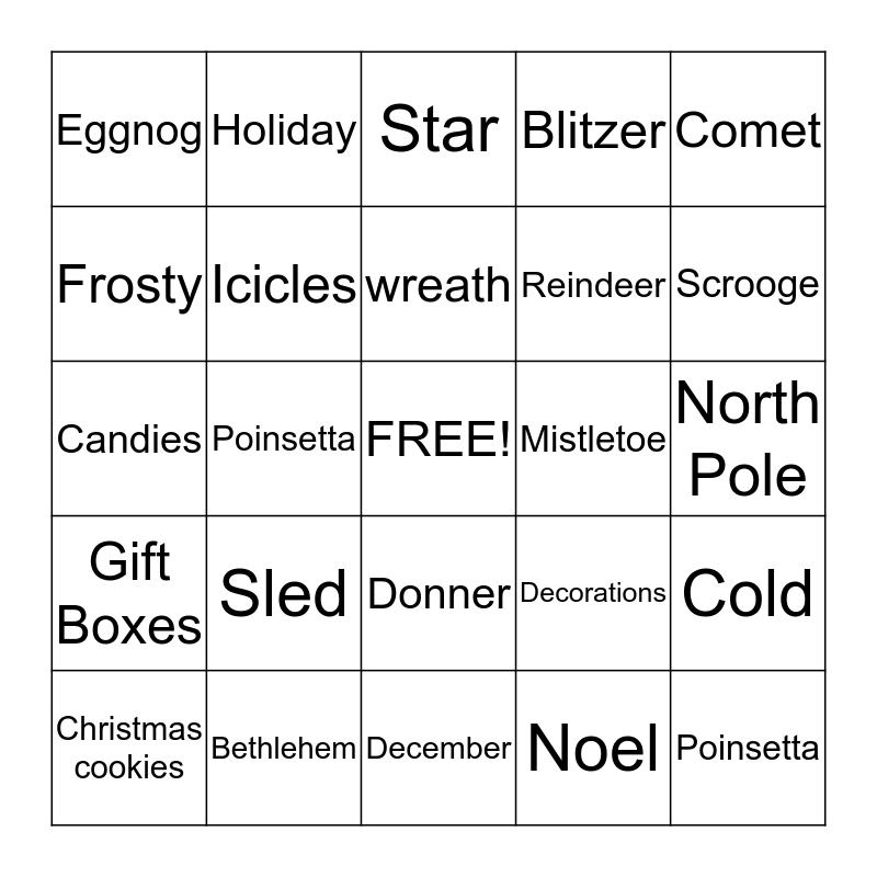 This bingo card has a free space and 24 words: Sled, Bethlehem, wreath, Christmas cookies, Comet, Eggnog, Frosty, Holiday, Mistletoe, Donner, Reindeer, Candies, Decorations, Cold, Icicles, Noel, North Pole, Star, Scrooge, Poinsetta, Poinsetta, Gift Boxes, Blitzer and December.