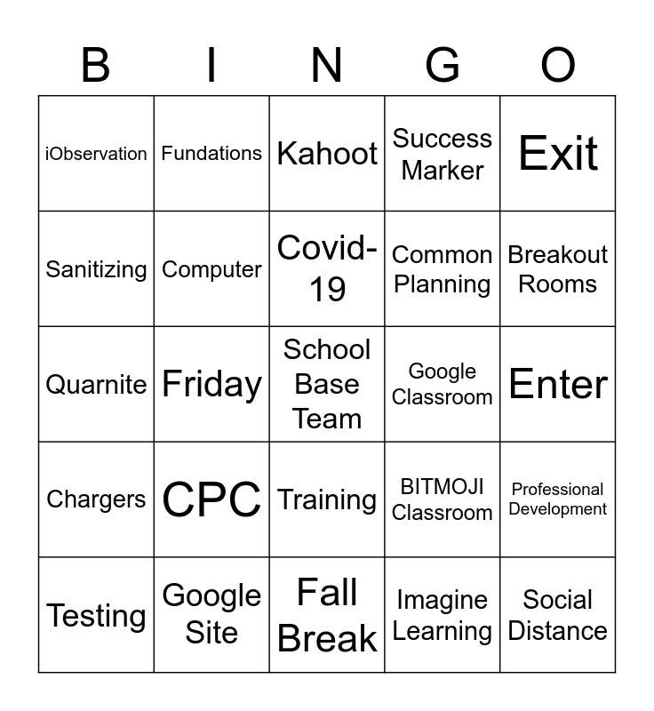This bingo card has 67 words: Free!, Brick and Mortar, Virtual, Professional Development, Students, TikTok, Fundations, iReady, Covid-19, CoronaVirus, Training, Cafeteria Duty, Enter, Exit, Hand Washing, Sanitizing, Friday, iObservation, WIG, Common Planning, CPC, Chargers, Success Marker, Imagine Learning, Report Card, Progress Report, Faculty Meeting, Google Meet, Breakout Rooms, PBPA, School Base Team, Professional Growth Plan, Code Red, Tornado Drill, Mask, Testing, FLCKRS, BITMOJI Classroom, Quarnite, Social Distance, CDC guidelines, Computer, Google Classroom, Email, Six Feet, Parent Conference, Extended Day, Google Site, Pear Deck, NearPod, Kahoot, Blender, Share Screen, Present Now, Google Calendar, Fall Break, Work From Home, Mute your Mic, Math, Reading, Science, Writing, Lesson Plan, Due Date, Diagnostic, School Grade and Storyworks.