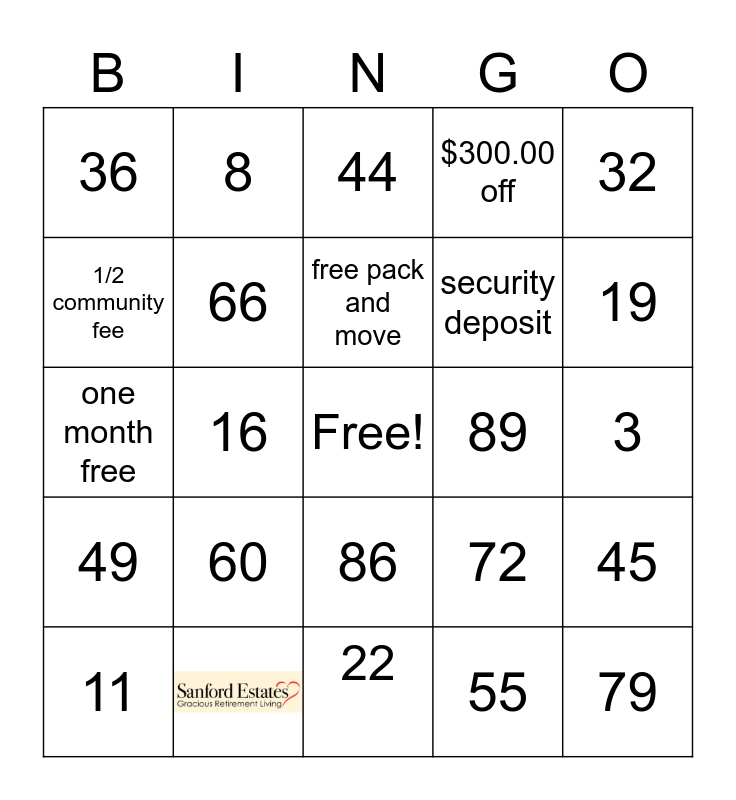 This bingo card has 1 images, a free space and 30 words: 22, 10, 16, 29, 36, 44, 66, 72, 89, 55, 3, 79, 81, 24, 19, 30, 45, 60, 49, 86, 32, 14, 11, 8, security deposit, 1/2 community fee, $300.00 off, one month free, free pack and move and grab and go meal.