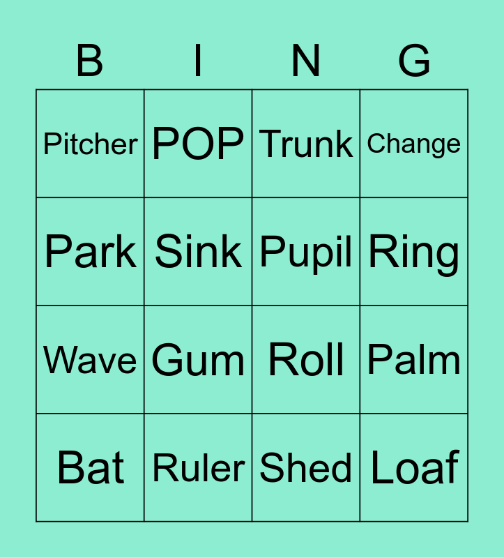 This bingo card has 16 words: Bat, Ruler, Trunk, Change, Park, POP, Roll, Palm, Pitcher, Sink, Shed, Ring, Wave, Gum, Pupil and Loaf.