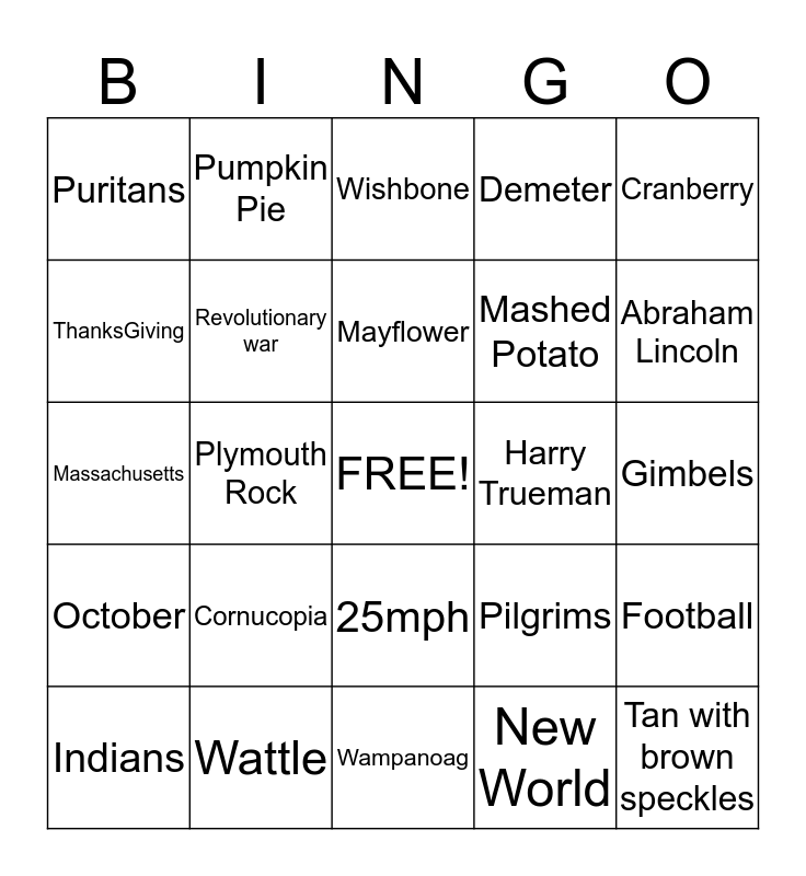 This bingo card has a free space and 24 words: Cornucopia, Wattle, Mayflower, Indians, Cranberry, Puritans, ThanksGiving, Pumpkin Pie, Harry Trueman, 25mph, Mashed Potato, Massachusetts, Pilgrims, Football, Revolutionary war, New World, Gimbels, Wishbone, Abraham Lincoln, Plymouth Rock, Tan with brown speckles, October, Demeter and Wampanoag.