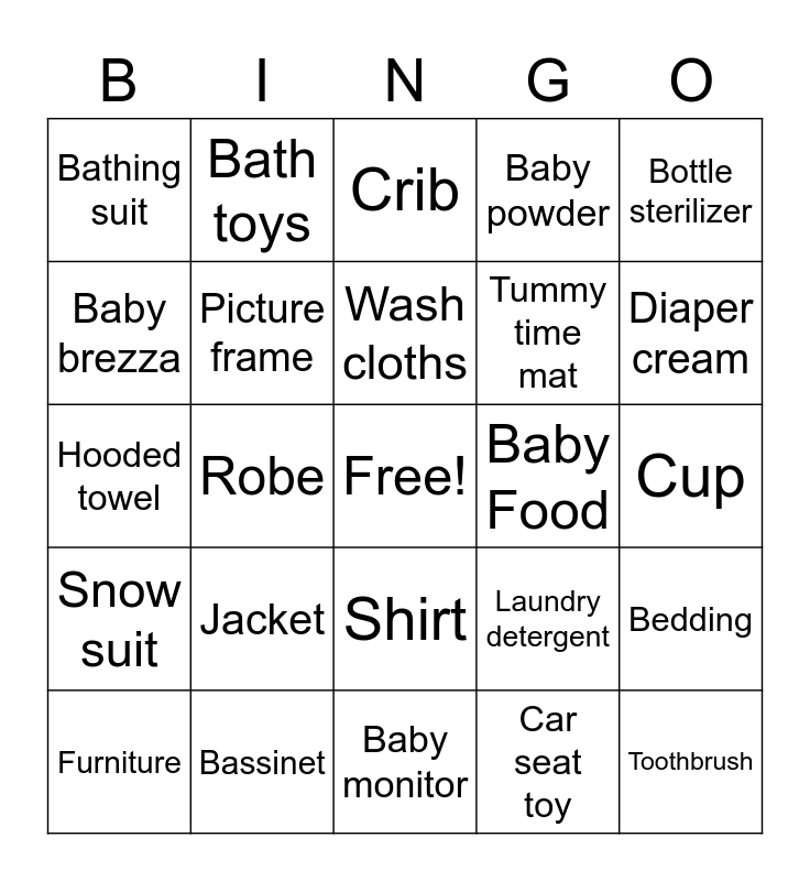 This bingo card has a free space and 99 words: Bib, Socks, Blanket, Crib, Car seat, Car seat cover, Swing, Teether, Toys, Night light, Photo album, Onesie, Pants, Shirt, Hat, Bathing suit, Bath toys, Lotion, Shampoo, Diapers, Wipes, Books, Bottles, Shoes, Pj’s, Bedding, Wash cloths, Bottle warmer, Diaper genie, Bath tub, Baby monitor, Car seat toy, Baby carrier, Stuffed animal, Robe, Hooded towel, Swing, Diaper bag, Nursery décor, Jacket, Pack and play, Diaper cream, Baby powder, Bassinet, Utensils, Thermometer, Burp cloths, Mobile, Boppy pillow, Shopping cart cover, Crib mattress, Toothbrush, Laundry detergent, Babyproofing items, Baby gate, Nasal aspirator, Diaper cream, Changing table, Highchair, Nail care kit, Humidifier, Walker, Slippers, Mittens, Swaddle blankets, Bottle sterilizer, Bottle cleaning brush, Piggy bank, Hair brush/comb, Snow suit, Pacifier, Tummy time mat, Baby brezza, Changing pad, Formula, Toy box, Picture frame, Gift card, Play Gym, Rubber Duck, Baby Food, Baby Food Blender, Bottle Rack, Sippy Cup, Alphabet Blocks, Rattle, Bowl, Plate, Cup, Furniture, Medicine, Something handmade, Something personalized, Spoons, Wipe warmer, Hand sanitizer, Rocking chair, Diaper Pail and Gift for mom.