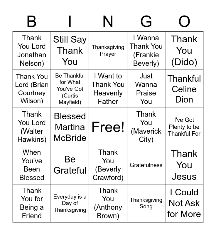This bingo card has a free space and 24 words: Be Grateful, Everyday is a Day of Thanksgiving, I Want to Thank You Heavenly Father, Thank You for Being a Friend, Thank You (Dido), Thank You Lord Jonathan Nelson), Thank You Lord (Brian Courtney Wilson), Still Say Thank You, Thank You (Maverick City), Thank You (Beverly Crawford), Just Wanna Praise You, Thank You Lord (Walter Hawkins), Gratefulness, Thank You Jesus, Be Thankful for What You've Got (Curtis Mayfield), Thanksgiving Song, I've Got Plenty to be Thankful For, Thanksgiving Prayer, Thankful Celine Dion, Blessed Martina McBride, I Could Not Ask for More, When You've Been Blessed, I Wanna Thank You (Frankie Beverly) and Thank You (Anthony Brown).