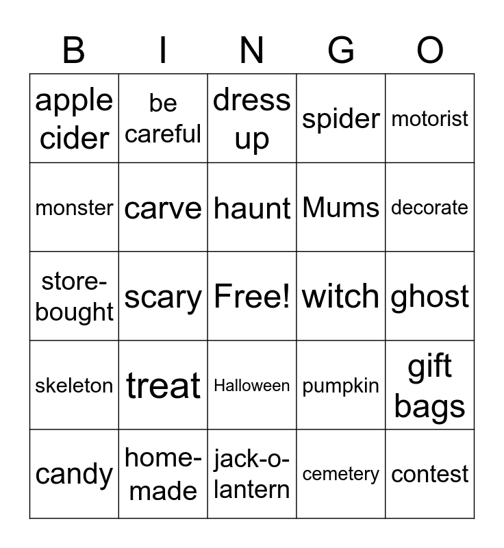 This bingo card has a free space and 29 words: candy, prize, scary, costume, apple cider, dress up, carve, treat, witch, home-made, ghost, contest, jack-o-lantern, cemetery, decorate, tombstone, Halloween, skeleton, motorist, store-bought, pumpkin, bat, Mums, monster, spider, be careful, gift bags, haunt and brew.