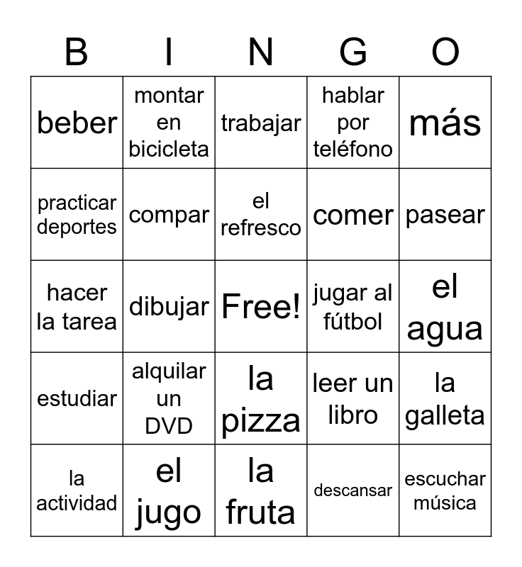 This bingo card has a free space and 24 words: alquilar un DVD, el jugo, el refresco, la actividad, más, beber, practicar deportes, montar en bicicleta, jugar al fútbol, la pizza, comer, hacer la tarea, leer un libro, la galleta, compar, descansar, el agua, trabajar, pasear, dibujar, escuchar música, estudiar, hablar por teléfono and la fruta.