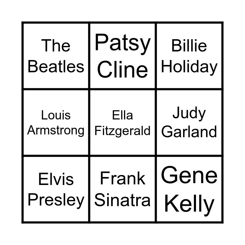 This bingo card has 9 words: Elvis Presley, Billie Holiday, Patsy Cline, Louis Armstrong, The Beatles, Judy Garland, Ella Fitzgerald, Gene Kelly and Frank Sinatra.