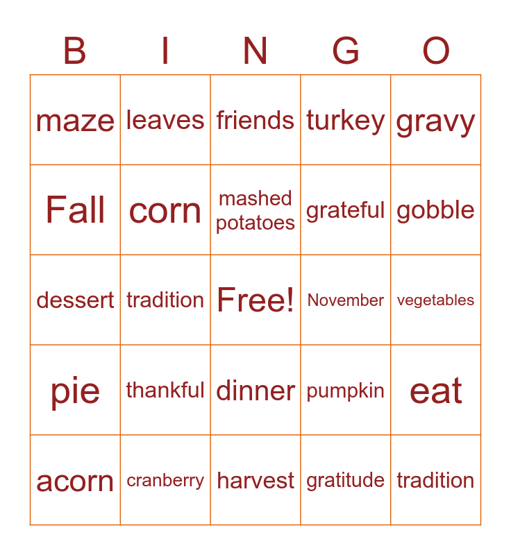 This bingo card has a free space and 29 words: acorn, yams, tradition, family, maze, friends, corn, thankful, November, cranberry, vegetables, tradition, harvest, gratitude, gobble, Thanksgiving, dinner, pie, gravy, dessert, pumpkin, football, grateful, Fall, turkey, leaves, eat, mashed potatoes and November.