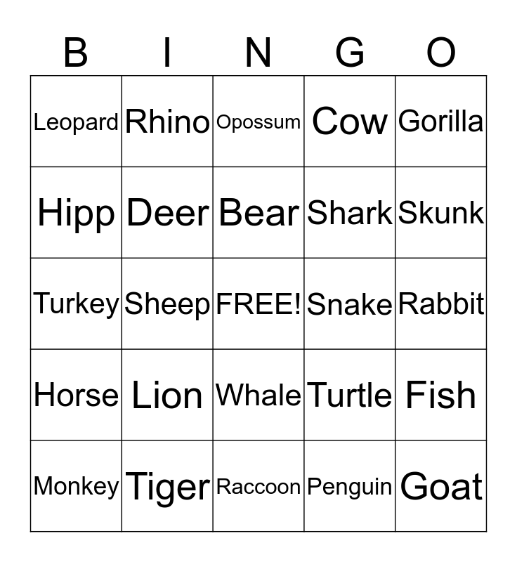 This bingo card has a free space and 24 words: Lion, Tiger, Bear, Monkey, Gorilla, Leopard, Hipp, Rhino, Snake, Whale, Shark, Turkey, Turtle, Fish, Deer, Penguin, Rabbit, Opossum, Skunk, Sheep, Goat, Horse, Cow and Raccoon.